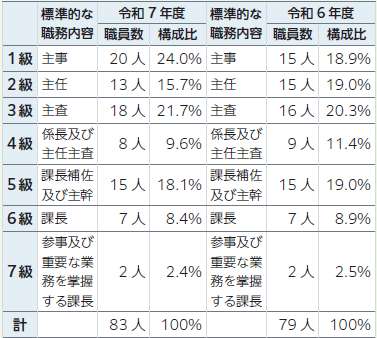 (4)一般行政職の級別職員数(各年度4月1日現在)