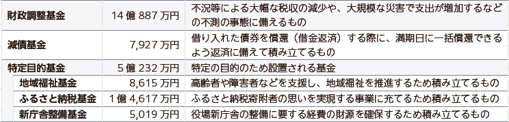 条例に基づき設置される「基金」は、言わば「町の貯金」で、予期せず収入が減少または支出が増加した場合や、特定の目的のために資金を積み立てています。臨時の出費や財源不足が見込まれる場合に、基金を取り崩して事業費に充てます。また、基金は将来負担比率の算定にも用いられます。
