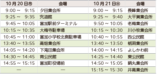 日程:10月20日(月)、10月21日(火)の2日間検診バスが各会場を巡回します。(お住まいの地区以外の会場でも受診できます。)