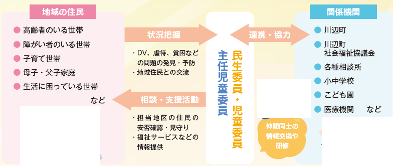 また、民生委員は児童福祉法によって「児童委員」も兼務しています。地域の子どもたちが元気に安心して暮らせるように、子どもたちを見守り、子育てや妊娠中の不安などの相談や支援を行います。