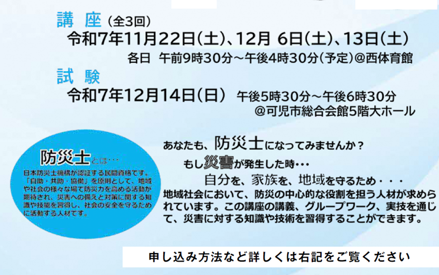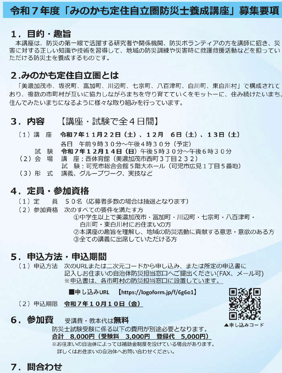 講座 防災士養成講座 受講者募集!! 1/20 次の記事 発行日 : 2025年09月22日 自治体名 : 岐阜県七宗町 広報紙名 : 広報ひちそう 令和7年9月号 七宗町役場 総務課 【電話】0574-48-1111【FAX】0574-48-2239【メール】[email protected] ※七宗町では、防災士試験受験に係る費用の補助金制度を設けています。 Tweet シェアする HICHISO DIGEST(ひちそう町ダイジェスト)