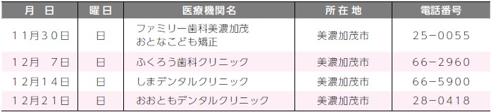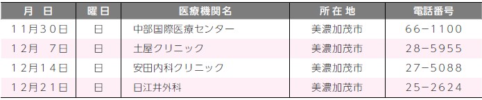 *都合により、変更する場合や途中休憩があります。各医療機関にご確認ください。(加茂医師会のホームページでも確認できます)