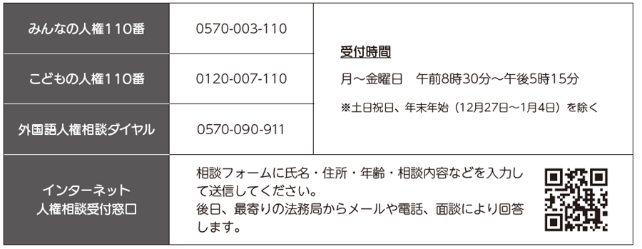 人権問題や差別、いやがらせなどの悩みごとを抱えている人は、一人で悩まずご相談ください。相談は無料で秘密は固く守られます。