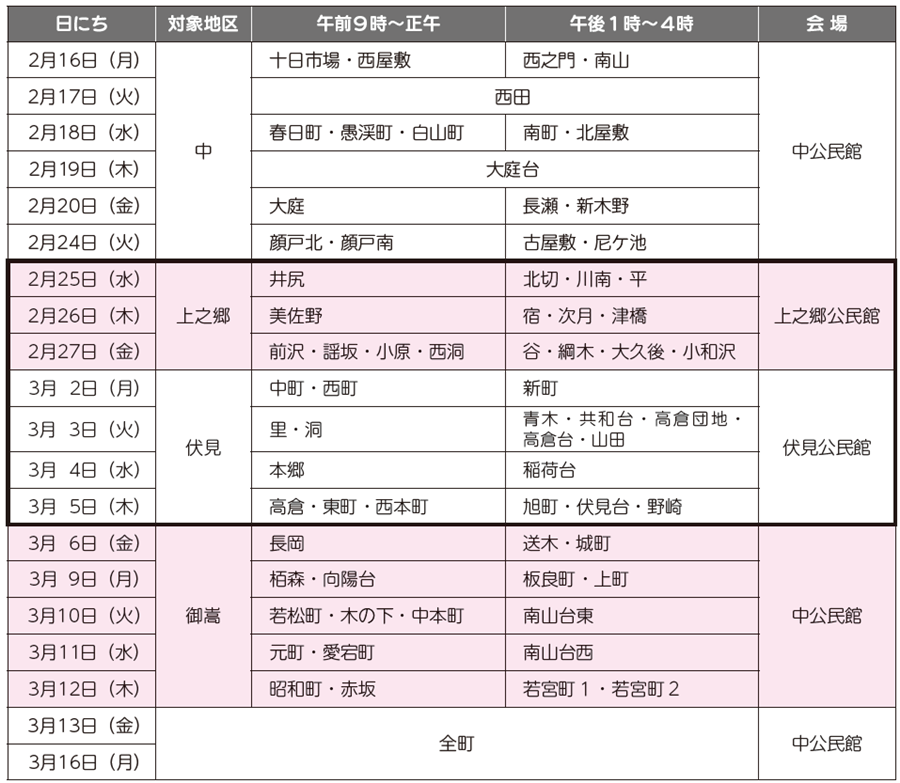 ほっとみたけ1月号の内容から上之郷地区、伏見地区の会場と日程を変更しましたのでご注意くださいますようお願いいたします。