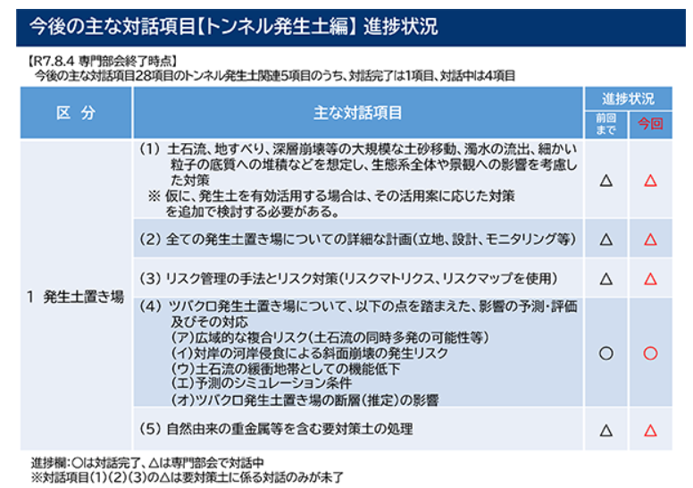 「トンネル発生土」では、自然由来の重金属などを含む「要対策土の処理」に関して、減量化、無害化、また安心安全の確保に向けた環境保全措置について、対話を行っていきます。