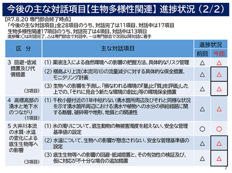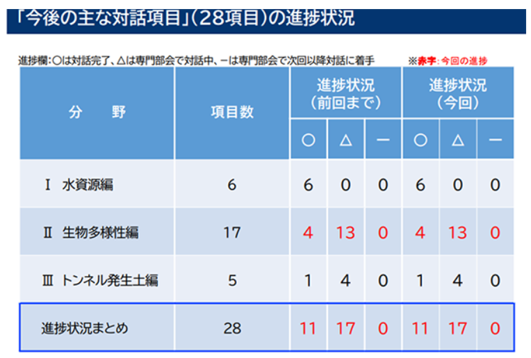 令和6年2月に整理した、JR東海との対話項目(3分野28項目)のうち、現在、「生物多様性」と「トンネル発生土」に関する対話を行っています。