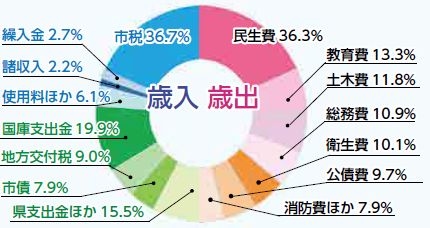 自主財源:市税、使用料など市が自ら収納、徴収できる財源。安定した行政運営のためには、歳入総額に対する割合が大きいほど望ましい。