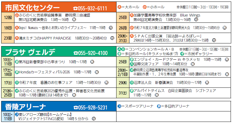 イベント 12月 市民文化センター・プラサヴェルデ・香陵アリーナの主な催し 21/22 前の記事 次の記事 発行日 : 2025年12月15日 自治体名 : 静岡県沼津市 広報紙名 : 広報ぬまづ 2025年12月15日号 (無)入場無料 (有)有料(料金等詳細についてはお問い合わせ下さい) ※催しは変更される場合があります。 Tweet シェアする 沼津で活躍する人を紹介するコーナー クローズアップ!!沼津人 その他のお知らせ(広報ぬまづ 2025年12月15日号)