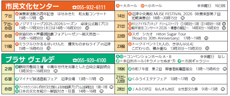 イベント 2月 市民文化センター・プラサヴェルデの主な催し 26/27 前の記事 次の記事 発行日 : 2026年01月15日 自治体名 : 静岡県沼津市 広報紙名 : 広報ぬまづ 2026年1月15日号 (無)入場無料 (有)有料(料金等詳細についてはお問い合わせ下さい) ※催しは変更される場合があります。 Tweet シェアする 沼津で活躍する人を紹介するコーナー クローズアップ!!沼津人 その他のお知らせ(広報ぬまづ 2026年1月15日号)