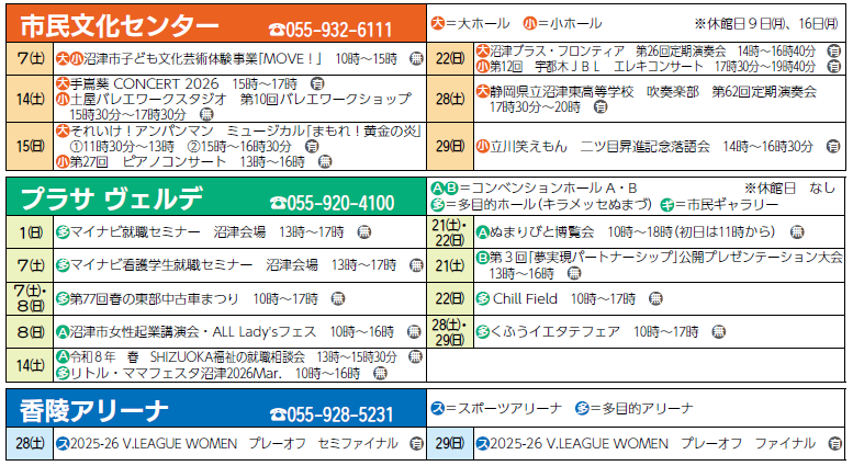 イベント 3月 市民文化センター・プラサヴェルデ・香陵アリーナの主な催し 20/21 前の記事 次の記事 発行日 : 2026年02月15日 自治体名 : 静岡県沼津市 広報紙名 : 広報ぬまづ 2026年2月15日号 (無)入場無料 (有)有料(料金等詳細についてはお問い合わせ下さい) ※催しは変更される場合があります。 Tweet シェアする 沼津で活躍する人を紹介するコーナー クローズアップ!!沼津人 その他のお知らせ(広報ぬまづ 2026年2月15日号)