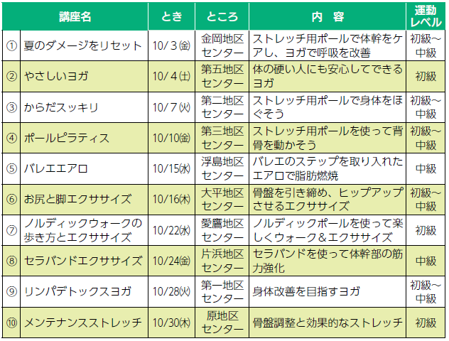 自分の体力に合わせて受講できる、様々なチャレンジ運動講座をご用意しました。この機会に身体を動かしてリフレッシュしませんか。