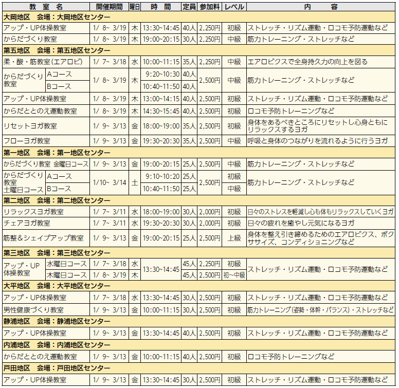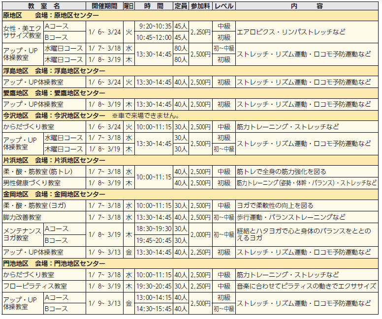 ※運動レベル…初級:運動不足解消、初~中級:健康増進、中級:体力維持、上級:体力向上
