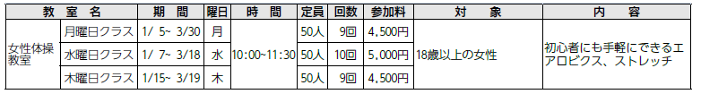 ※「女性・美エクササイズ教室」、「アップ・UP体操教室」、「ヨガ教室」は、各1教室の申込です。