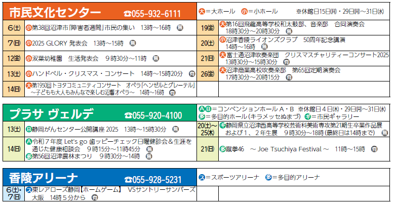イベント 12月 市民文化センター・プラサヴェルデ・香陵アリーナの主な催し 19/20 前の記事 次の記事 発行日 : 2025年11月15日 自治体名 : 静岡県沼津市 広報紙名 : 広報ぬまづ 2025年11月15日号 (無)入場無料 (有)有料(料金等詳細についてはお問い合わせ下さい) ※催しは変更される場合があります。 Tweet シェアする 沼津で活躍する人を紹介するコーナー クローズアップ!!沼津人 その他のお知らせ(広報ぬまづ 2025年11月15日号)