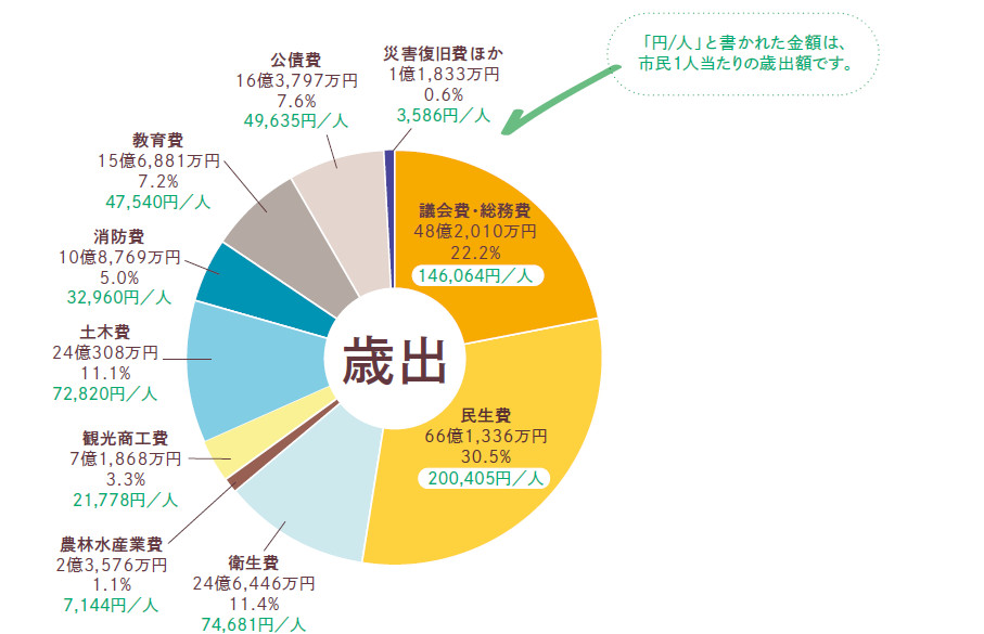 市民1人当たりに656,613円が使われた計算になりました。(令和7年3月31日現在人口33,000人)