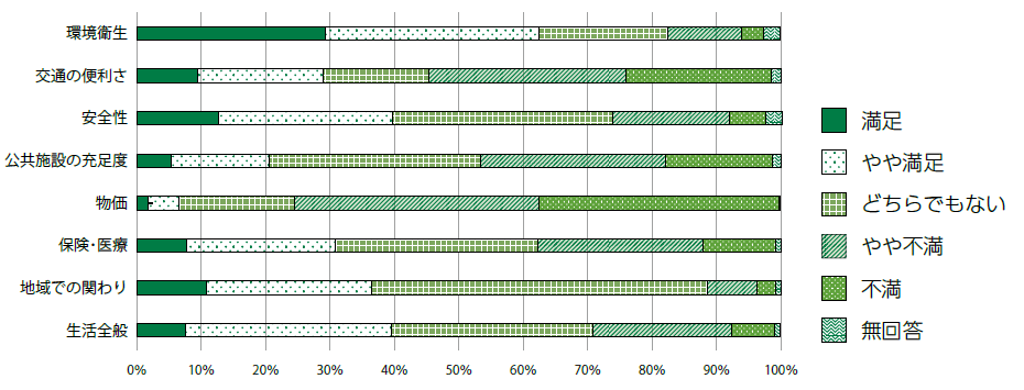 「満足」と「やや満足」を合わせた満足度は、1番高い環境衛生に関しては62.4%となっていますが、1番低い物価に関しては6.6%と項目によってばらつきがあります。生活全般については39.5%と昨年度の37.5%より2.0ポイント増加しました。