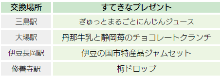 駿豆線沿線市町の「推しスポット」を巡るウォークandスタンプラリーを実施します。すべてのスタンプを集めて、駿豆線指定の駅で提示すると、先着でプレゼントが受け取れます。また、アンケートに回答した人から抽選で「沿線市町の特産品」が30人に当たります。