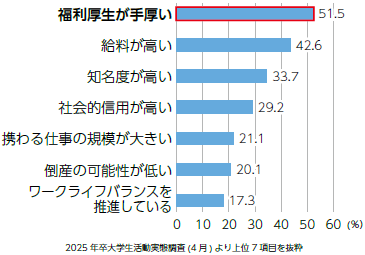 (株)マイナビが2025年3月卒業の大学生・大学院生を対象に行った調査では、大企業の選考に参加した決め手として、約半数が「福利厚生が手厚い」と回答しており、働く人が企業に求めるものは、賃金よりも福利厚生であることがわかります。