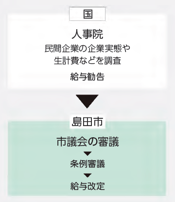 国家公務員の給与を決める人事院による給与勧告を基に、国・県・他の市町の職員の給与などを考慮して、市民の代表である市議会で審議され、条例で定められます。