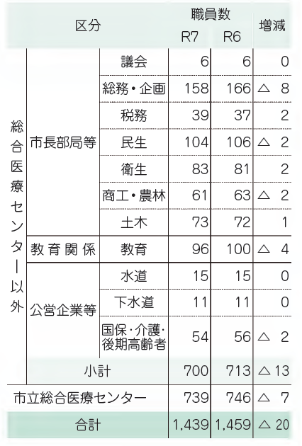 市では、医療・福祉・土木・教育などの広い分野で、1439人の職員が働いています。市民の信頼のもとに行政を進めていくため、職員の給与と職員数をお知らせします。(数値は、令和7年4月1日現在のものです。)