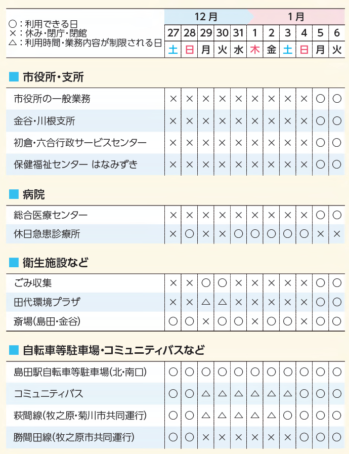 年末年始の市の業務や施設の開館情報などをお知らせします。