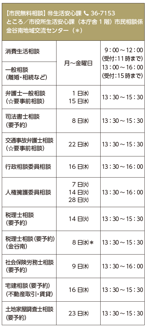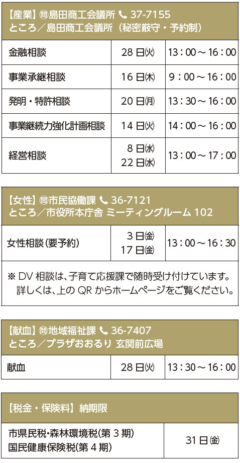くらし 10月便利帳(1) 17/23 前の記事 次の記事 発行日 : 2025年09月15日 自治体名 : 静岡県島田市 広報紙名 : 広報しまだ 2025年9月号 年間を通して、定期的に実施する相談窓口については、市ホームページをご覧ください。 ■同報無線自動電話応答 放送内容を電話で聴けます【電話】37-5600 ※放送後24時間以内。 問合せ:危機管理課 【電話】36-7143 Tweet シェアする 彩りもう一品 10月便利帳(2)