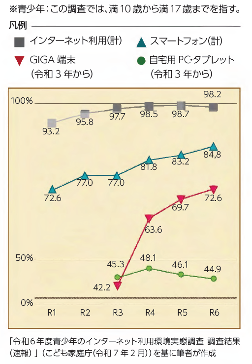 私たちを取り巻く環境は、急激に変化している。若年層では学校でGギガIGA(ギガ)端末を使用するなど、日常でインターネット(以下「ネット」)を利用する時間が増加している。右の調査によると、3歳で約7割、5歳で約8割、8歳以上は9割、15歳以上になると約10割がネットを利用している。ネットにはあらゆる情報があふれており、誰もが情報の取捨選択をする必要がある。また、広告などで不適切なものを見ることも少なくない。