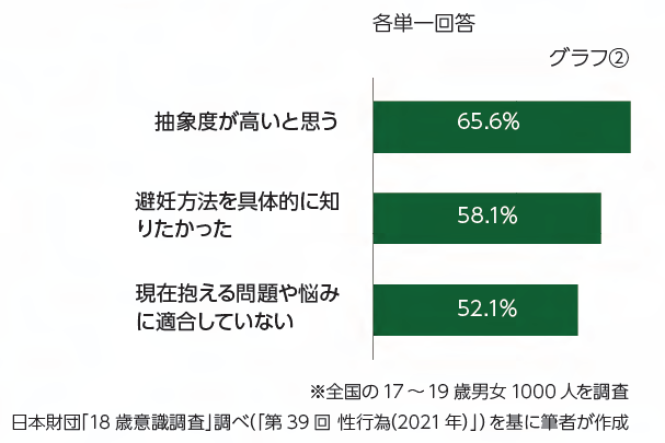 上の調査では、学校での性教育について「役に立ったか」との質問に対して、58.5%が「はい」と回答した。しかし、若者たちは、「性の知識が十分ある」と答える人が少ない(グラフ(1))。「どう感じましたか」との問いには、「抽象度が高い」「避妊方法を具体的に知りたかった」(グラフ(2))などが挙げられた。つまり、学校の性教育では、必要だと思う内容が網羅されていない。