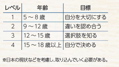 国際的な基準では5歳からですが、実際には何歳から始めても問題はありません。例えば、入浴のときに「自分の体は自分で洗う」ことを習慣にするなど、日常生活の中で自然と身に付けていくことが大切です。さらに、年齢や発達段階に応じて学びを積み重ねていくことが重要。その土台がなければ理解が難しくなるため、大人も子どもと一緒にレベル1から学び始めるのが望ましいでしょう。