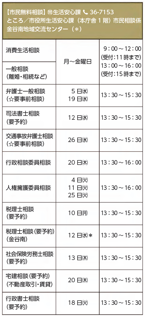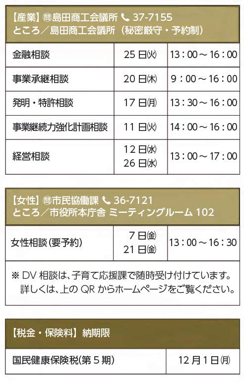 くらし 11月便利帳(1) 22/28 前の記事 次の記事 発行日 : 2025年10月15日 自治体名 : 静岡県島田市 広報紙名 : 広報しまだ 2025年10月号 年間を通して、定期的に実施する相談窓口については、市ホームページをご覧ください。 ☆事前に一般相談を受けた後、各相談予約を入れます。 ■同報無線 自動電話応答 放送内容を電話で聴けます【電話】37-5600 ※放送後24時間以内。 問合せ:危機管理課 【電話】36-7143 Tweet シェアする 彩りもう一品 11月便利帳(2)