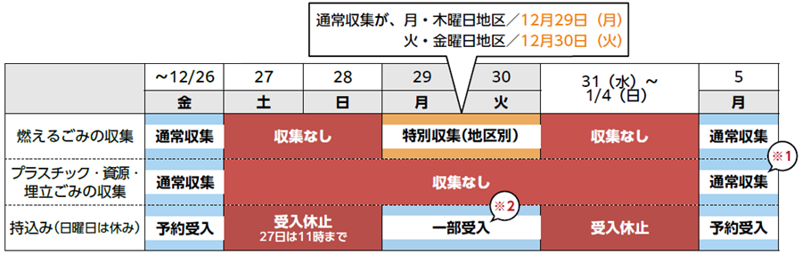 ※1 資源ごみ・埋立ごみの収集が木曜日・金曜日の地区は、1月の収集日が1週ずつ後倒しになります。詳しくは、ごみカレンダーでご確認ください。