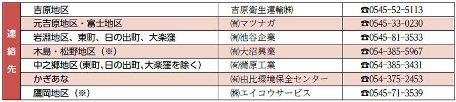 年末年始の詳しい収集日の確認や緊急の場合は、各地区の収集業者にお問い合わせください。