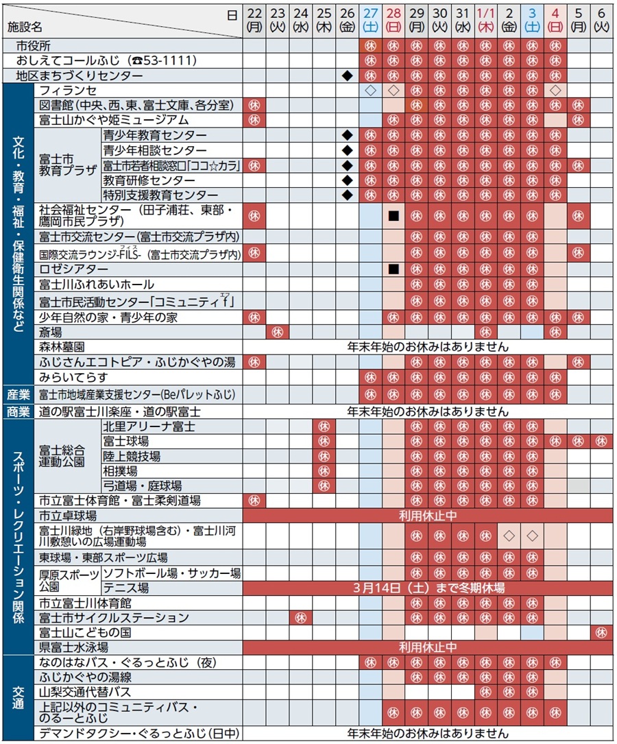 ※「ぐるっとふじ」は、日中ルートと夜ルートで年末年始の休みが異なります。