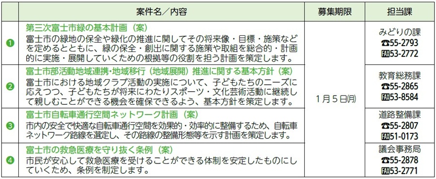 ※詳しくは、各担当課、市役所2階総合案内、中央図書館、各地区まちづくりセンターにある資料や、市ウェブサイトのパブリック・コメントページをご覧ください。