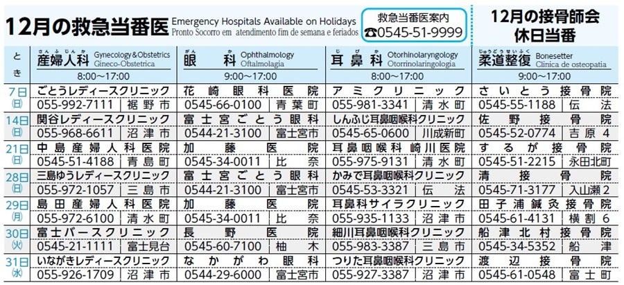 ※12月26日(金)の夜間等一次救急の診療時間は、病院へ電話でお問い合わせください。