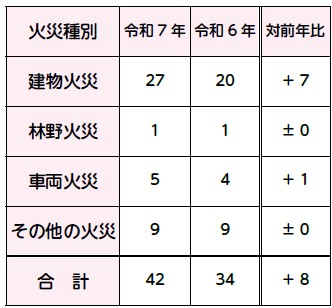 市内で今年1~6月に発生した火災の件数は42件でした。前年同時期と比べると、8件増加しています。