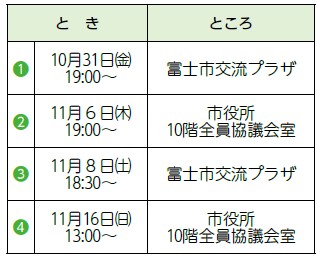 申込み:各日程の1週間前までに、市ウェブサイトで電子申請するか、電話またはFAXで、氏名(ふりがな)・住所・年齢・電話番号またはメールアドレス・希望するテーマを記入し、議会事務局へ【FAX】53-2771