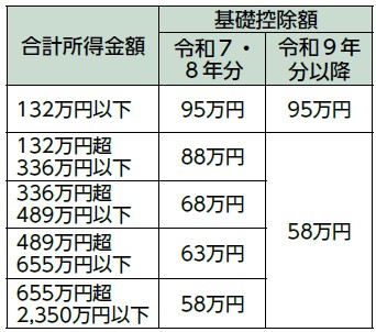 令和7年分確定申告や年末調整から、合計所得金額が2350万円以下の場合、基礎控除額が58万円に変更されます。