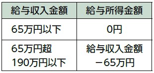 給与収入金額が190万円以下の場合、給与所得控除は65万円になります。給与の収入金額が190万円を超える場合、給与所得控除額に変更はありません。