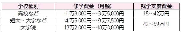※学校種別、公・私立の別、通学条件などによって貸付金額が異なります。
