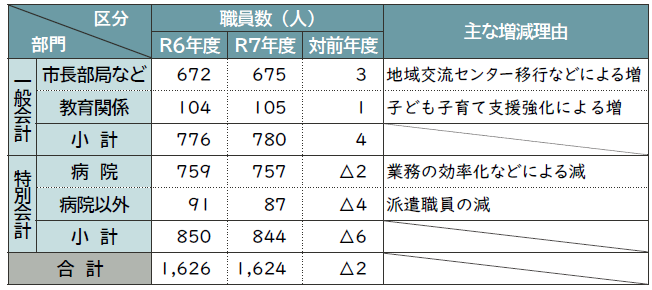 令和7年4月1日現在の職員数は1,624人で、前年の職員数と比較して2人減少しています。