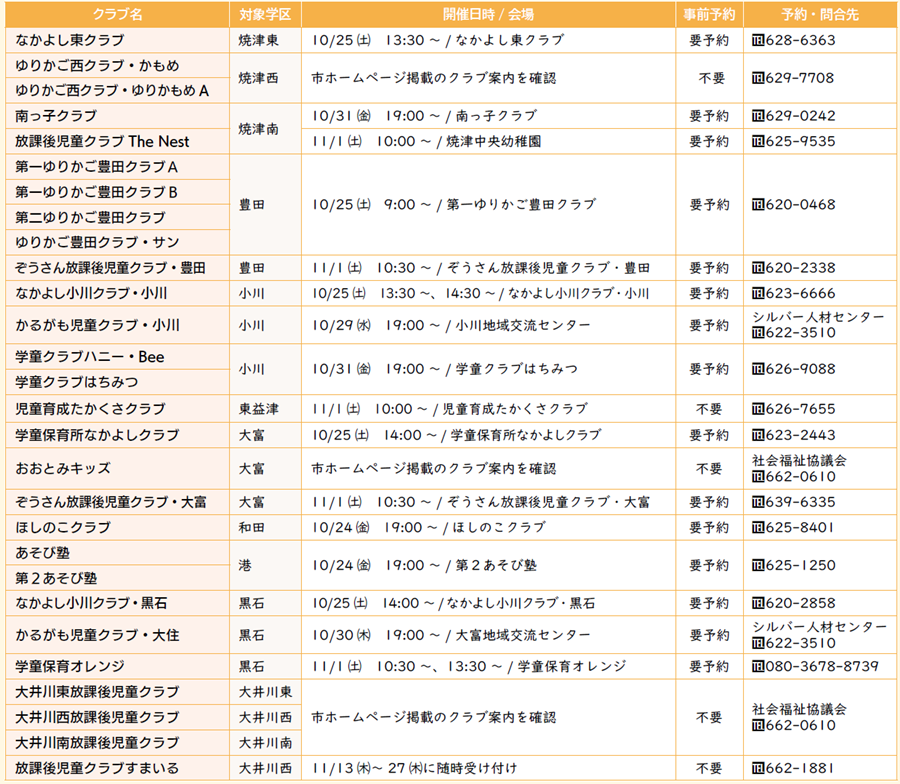 令和8年4月からの放課後児童クラブ(学童保育)の利用者を募集します。利用を希望する場合は、必ず別表の説明会に参加、または市ホームページを確認してください。参加に事前予約が必要なクラブがありますので、注意してください。