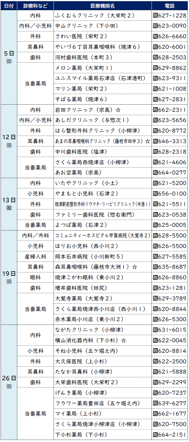 くらし 〔10月の生活情報〕休日当番医と休日当番薬局 20/49 前の記事 次の記事 発行日 : 2025年10月01日 自治体名 : 静岡県焼津市 広報紙名 : 広報やいづ 2025年10月1日号 ※変更になる場合があります。詳しくは各問合先に問い合わせてください。 診療時間:8:30~17:00(☆印は9:00~17:00) ※歯科は9:00~15:00。 Tweet シェアする 〔10月の生活情報〕相談室 〔10月の生活情報〕上水道工事休日当番店