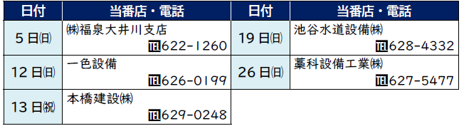 くらし 〔10月の生活情報〕上水道工事休日当番店 21/49 前の記事 次の記事 発行日 : 2025年10月01日 自治体名 : 静岡県焼津市 広報紙名 : 広報やいづ 2025年10月1日号 時間:8:30~17:00 問合先:各当番店 Tweet シェアする 〔10月の生活情報〕休日当番医と休日当番薬局 11月の健康の窓