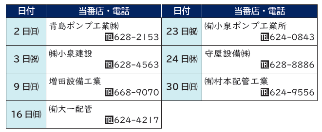 くらし 上水道工事休日当番店 34/48 前の記事 次の記事 発行日 : 2025年11月01日 自治体名 : 静岡県焼津市 広報紙名 : 広報やいづ 2025年11月1日号 時間:8:30~17:00 問合せ:各当番店 Tweet シェアする 〔お知らせコーナー〕善意をありがとう 協定を締結