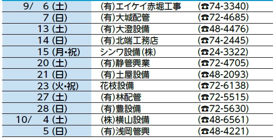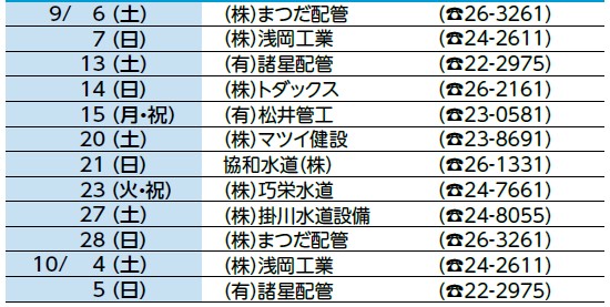 くらし 宅地内の水道修理の連絡先(土・日・祝日)9/6~10/5 20/35 前の記事 次の記事 発行日 : 2025年09月01日 自治体名 : 静岡県掛川市 広報紙名 : 広報かけがわ 令和7年9月1日号 ※宅地内の水道修理は有料です。 ■北部(掛川区域) ■南部(大東・大須賀区域) 問合せ:水道課 【電話】21-1717 Tweet シェアする 風水害・地震・津波対策寄附金 多くのご支援 ありがとうございます 平日夜間・休日の救急診療はまず小笠掛川急患診療所