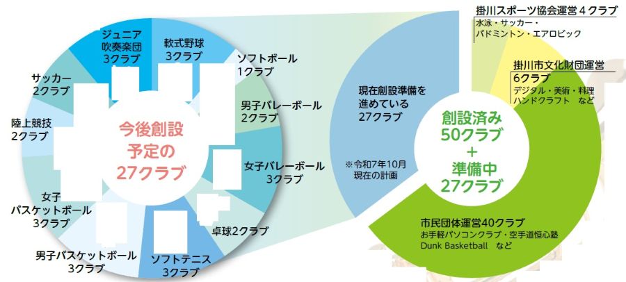 今後もさまざまな種目のクラブが創設される可能性があり、掛川市スポーツ協会と掛川市文化財団が新たに27クラブの創設準備を進めています。