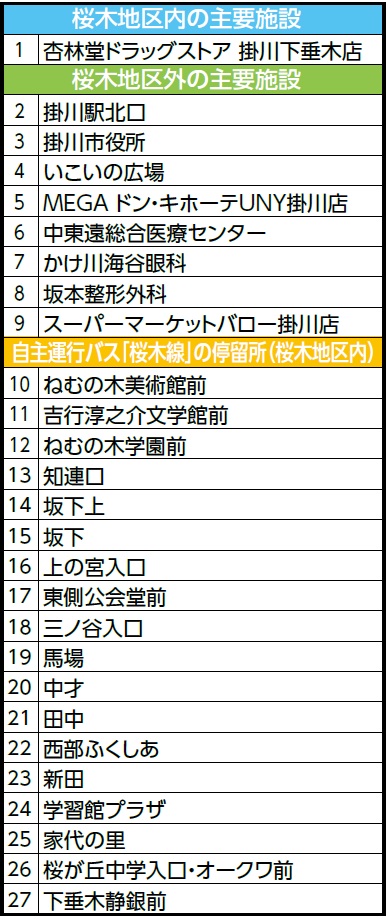 桜木地区内全域、地区外にある主要施設(掛川駅北口、中東遠総合医療センターなど)