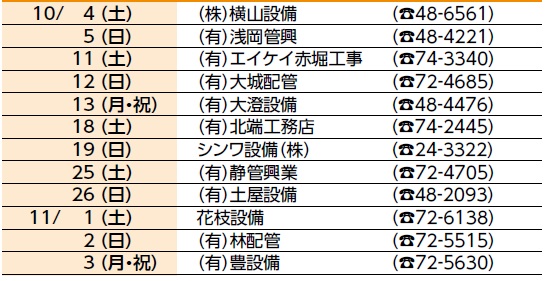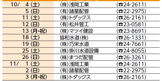くらし 宅地内の水道修理の連絡先(土・日・祝日) 10/4~11/3 17/32 前の記事 次の記事 発行日 : 2025年10月01日 自治体名 : 静岡県掛川市 広報紙名 : 広報かけがわ 令和7年10月1日号 ※宅地内の水道修理は有料です。 ■北部(掛川区域) ■南部(大東・大須賀区域) 問合せ:水道課 【電話】21-1717 Tweet シェアする 風水害・地震・津波対策寄附金 多くのご支援ありがとうございます 平日夜間・休日の救急診療はまず 小笠掛川急患診療所