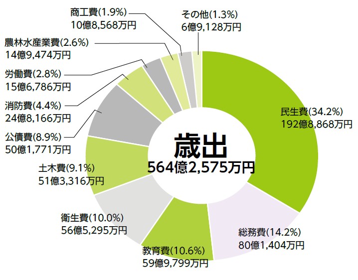 民生費:障がい者や高齢者に対する福祉、子育て支援のための経費です。